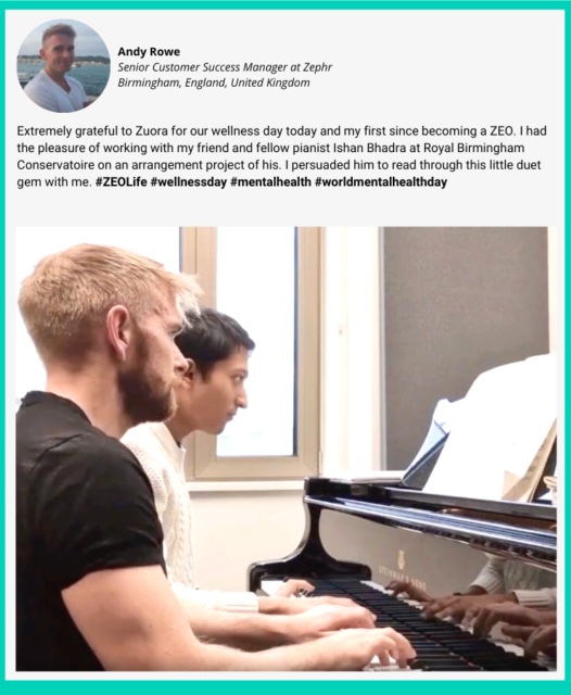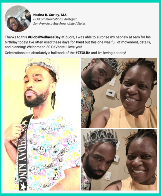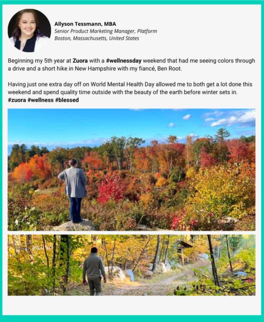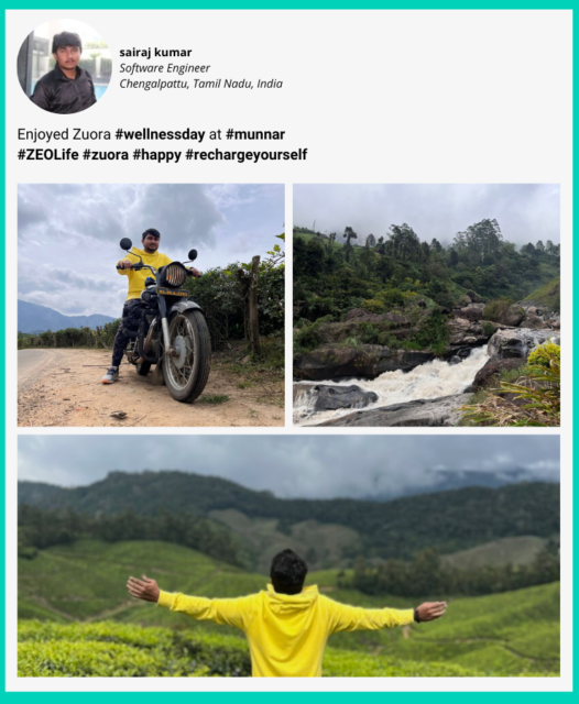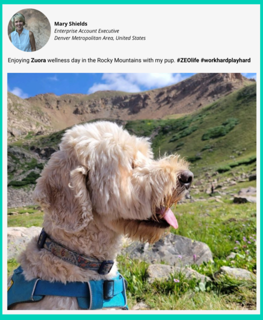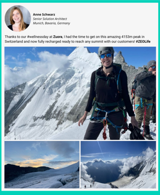 ZEOs all over the world are able to take advantage of Zuora’s global Wellness Days, which are paid days off, eight times a year. These days create space for our authentic selves to show up, recharge, and explore in ways that are as unique as each ZEO. It’s inspiring to see the many different ways our ZEOs spend their extra personal time—a true demonstration of how our #ZEOLife culture creates space for our authentic selves to show up.