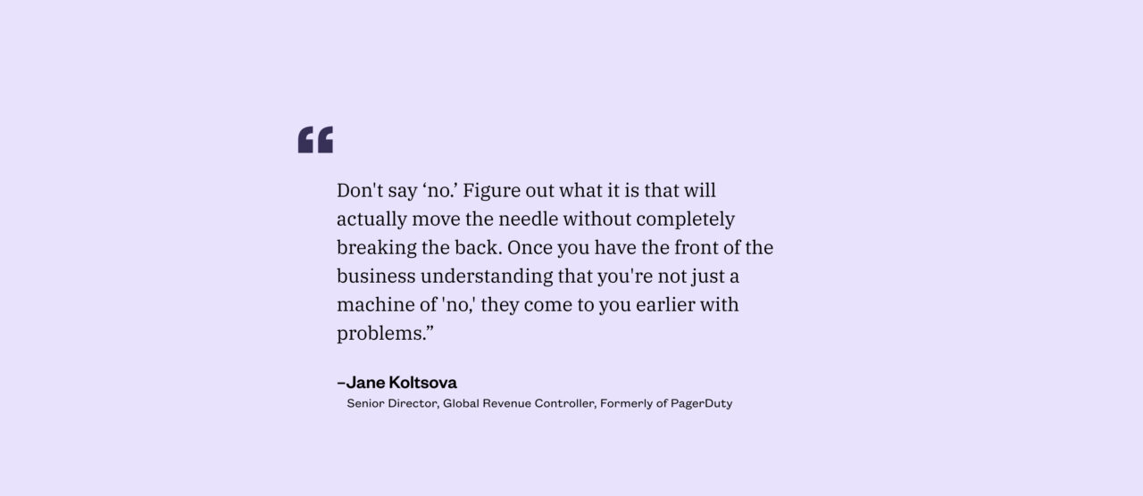 Further emphasizing the stakes involved, Koltsova explains, “If you have a restatement of the financials, none of your stock is going to change. Bad things are going to happen, and people are going to get fired. So if you start with folks who understand that, you end up then widening that aperture and saying, ‘Okay, now bring in Product, bring in Go-to-Market, bring in Sales Ops.’”