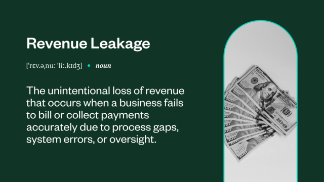 Revenue leakage refers to unintentional revenue loss. Most leakage happens when a business fails to collect payment because of system errors, contractual oversights, or gaps in its billing processes. It’s particularly devastating to subscription-based companies, which can lead to missed renewals, incorrect pricing, uncollected payments, or unbilled upgrades.