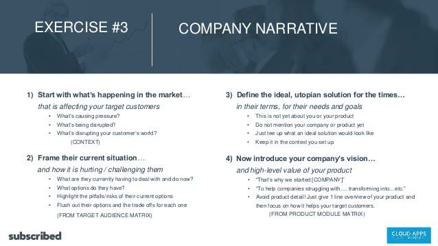 So your team has gone off-site and worked through this together, traveling from room one to room three. Now it’s time for your entire leadership team to bring all that together as your company narrative. This is literally an internal word doc, not for public (or board) consumption. But in the end, you’ll have your core end-to-end story that you can leverage on your website, in your product messaging, in your sales presentation, in your marketing collateral – everywhere! Company alignment around one story.