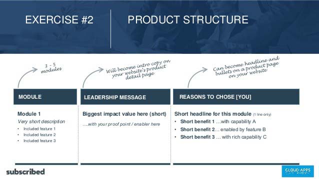 When you have a ton of features, I like to do something called the “52 card pickup.” Take all of your features, however they’re organized, and start reshuffling them to fall into different possible buckets/modules. Each module should focus on a specific value. This is an iterative process, so keep shuffling. Ultimately the handful of modules that you reshuffle your features into will enable you to better speak to the full value of your product, without losing the forest for the trees. For the 52 card pick-up, I recommend using the product module matrix: