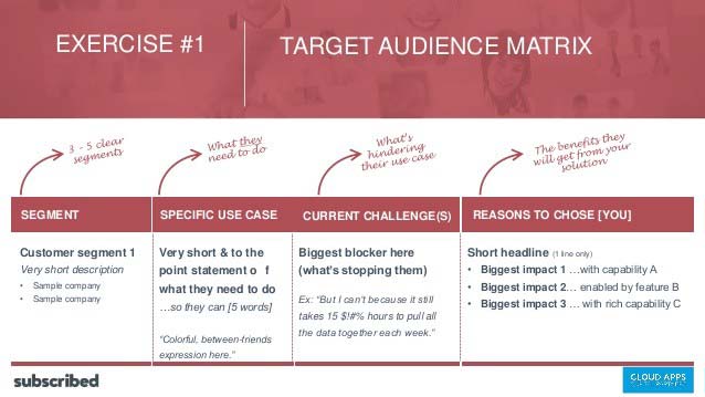 1. Audience. This is first and foremost. Nobody sells to one homogeneous blob of prospects. What are your unique target segments? Fully understanding those unique segments (and the nuanced differences amongst them) is the most important foundational piece to have in place before you start anything else – and you can attack this even before your product has gone to market. I recommend using the following target audience matrix to identify and clarify your unique target segments.