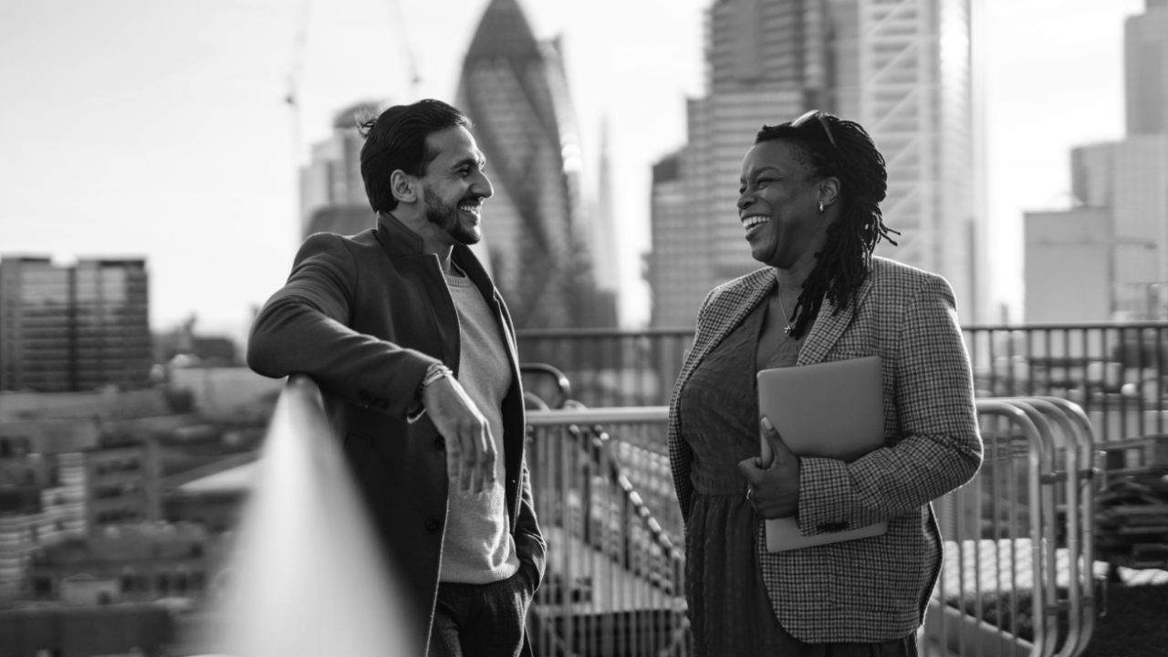 Two people stand on a rooftop, smiling and talking. City buildings are visible in the background. One holds a laptop.