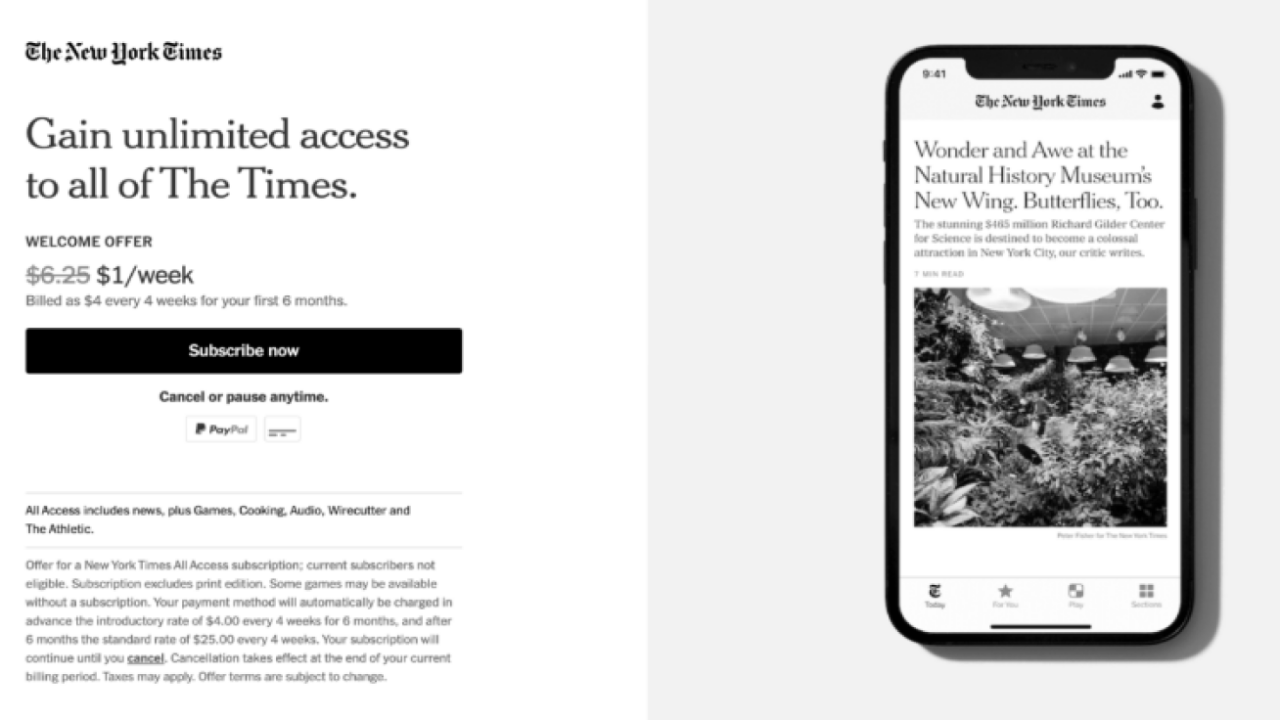 An offer for The New York Times subscription is shown on a laptop screen, and an article about a museum's new wing is displayed on a smartphone.
