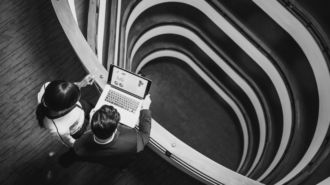 Two people stand on a spiral staircase landing, looking at a laptop displaying charts.