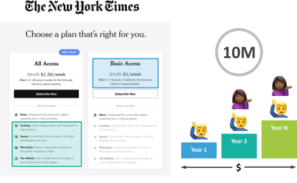 The “All Access” bundle may include additional services like cooking recipes, crossword games, in-depth sports coverage, etc., with an optional free bonus subscription to a family member. As a result, NYT not only monetizes existing super-active users but also develops a new subscriber base to cross and upsell to.