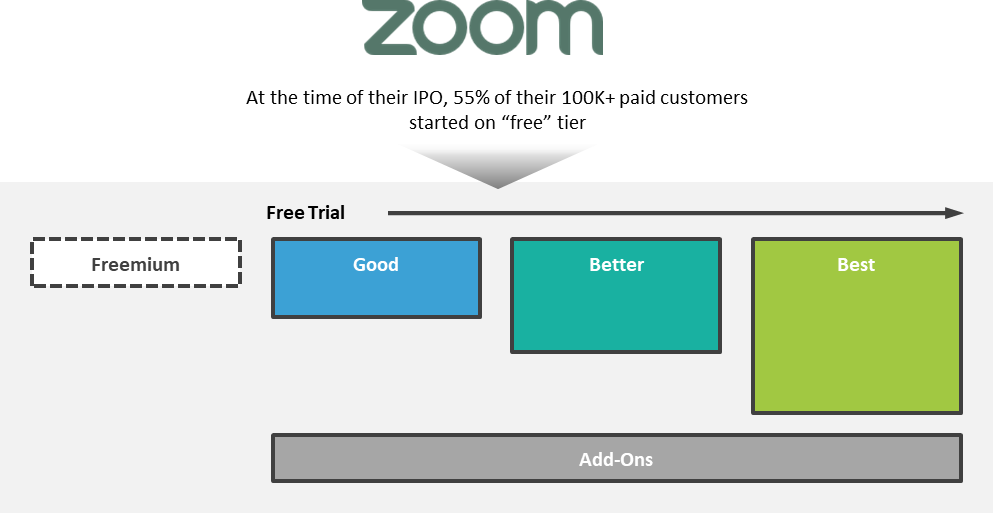 Zoom offered choices in terms of ‘Freemiums’ where subscribers could trial the full product capabilities for 40 minutes but would eventually have to upgrade to a paid tier. They didn’t stop there and offered a choice in terms of add-ons like Zoom phone and Zoom rooms. In fact, 55% of Zoom’s 100,000+ subscribers (at the time of the IPO subscribers) used Zoom’s basic offering before moving to a paid tier.