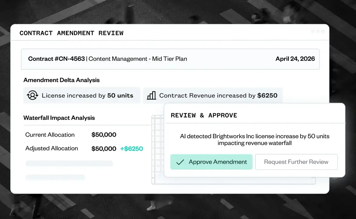 契約のトリアージ作業を手作業から削減します。改定による差分を自動抽出し、配賦およびウォーターフォールへの影響を可視化し、収益ルールの更新案を提示します。