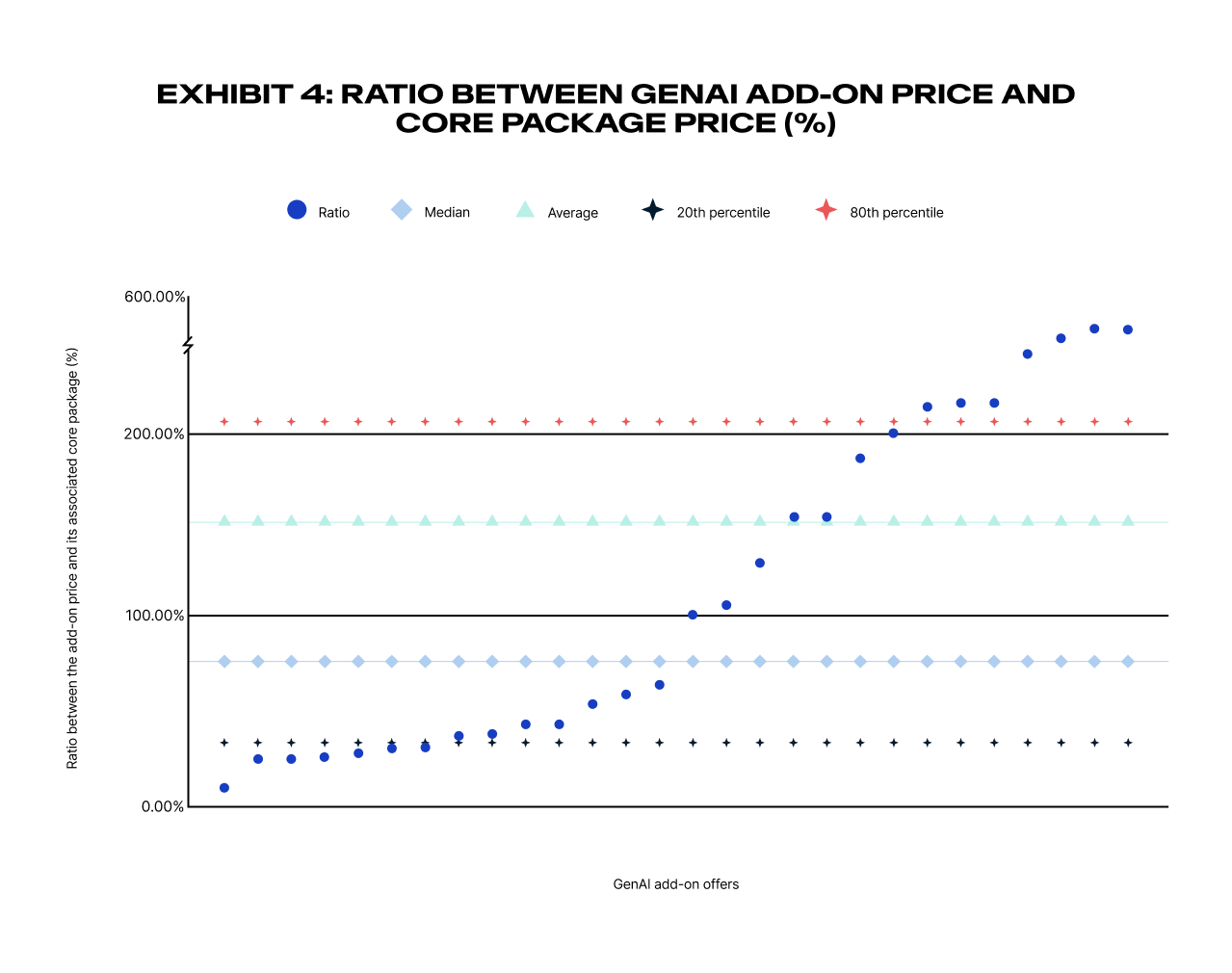 下記のチャートにまとめた分析によると、生成AIアドオンの平均価格は、関連するコアパッケージの148%、中央値は83%(図 4)となっています。この平均値と中央値の大きな乖離は、SaaS領域で一般的に見られる分布とは異なり、極端な価格設定があるためと考えられます。後述の通り、この異常値には合理的な理由がある場合もあります。