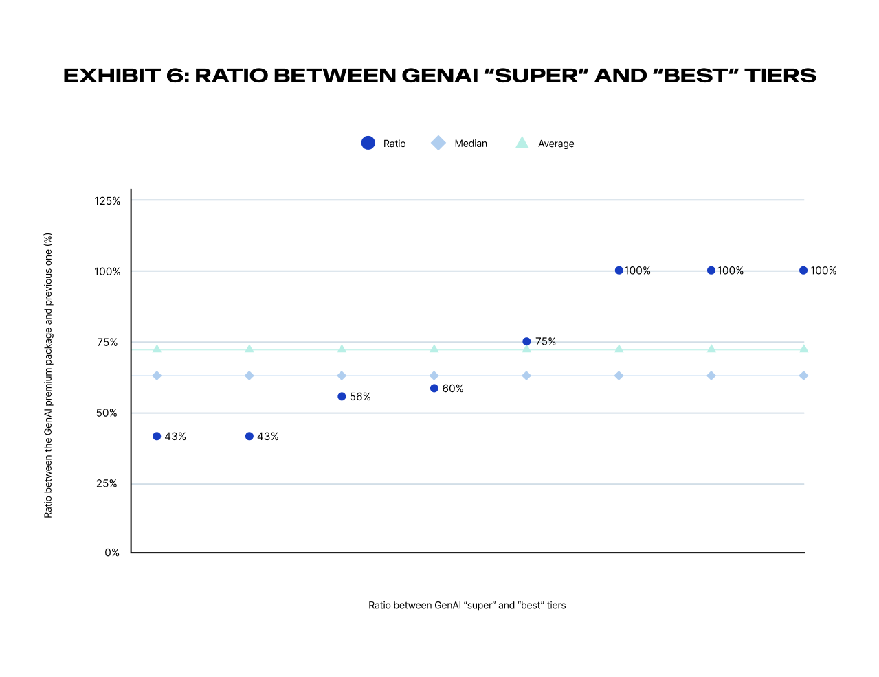 意外にも、この手法では「SaaSらしい」階層間の比率がデータで示されており、生成AIをアドオンとして販売した場合の分析とは対照的です(図 6)。新たな上位ティアは、直下の階層より平均72%高い価格設定となっており、データ上は43%から100%のプレミアムが見られます。