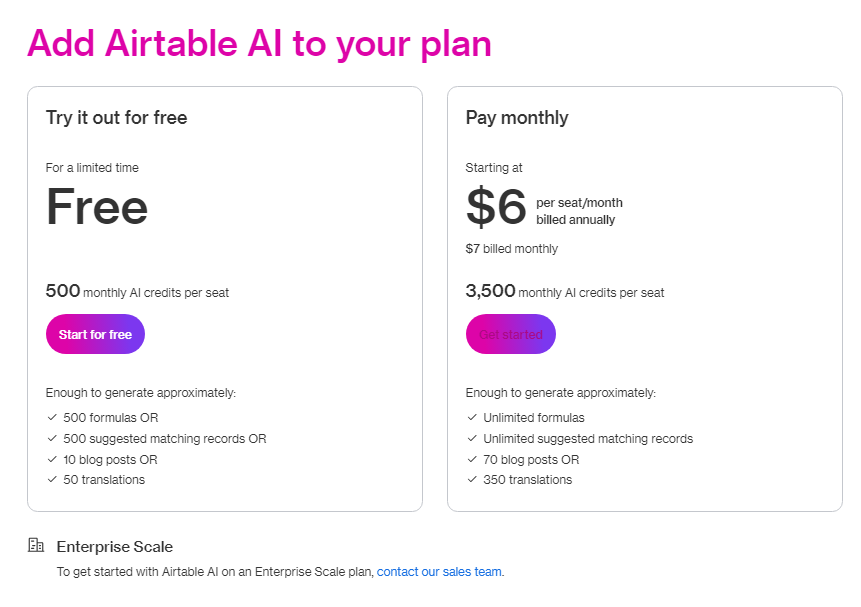 画像:2024年4月時点のAirtable AI料金ページ
