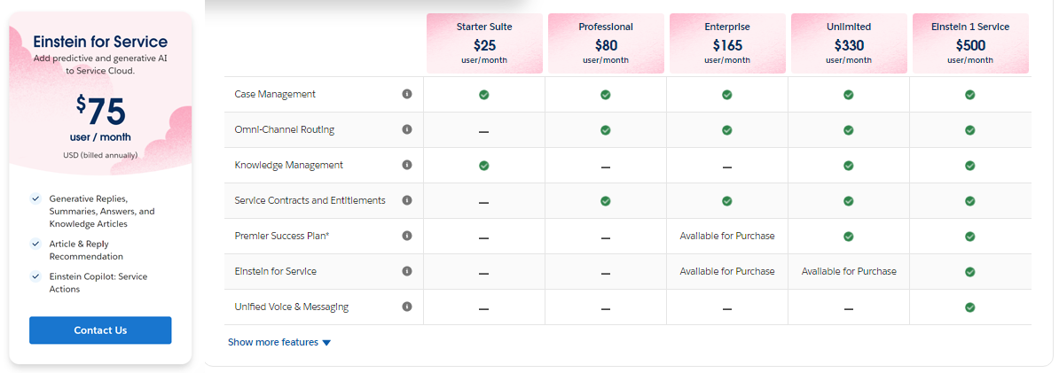 画像:SalesforceのService CloudおよびEinsteinアドオンの料金ページ(2024年4月時点)