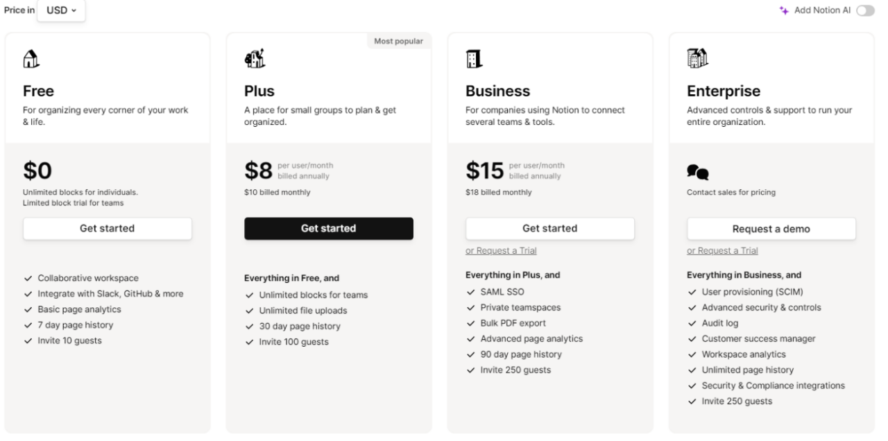 Notion AIは、テキスト変換、簡単なタスク自動化、ワークスペース内での新規コンテンツ生成などによりユーザー体験を向上させます。全プラン(無料プラン含む)で1ユーザーあたり月額8ドルでアドオン契約が可能であり、これはBusinessエディション価格の56%、Plusエディションとは同額(つまり100%)に相当します。