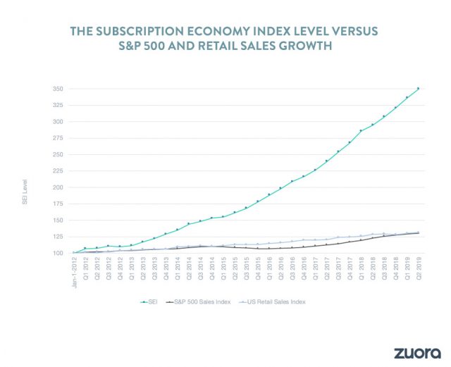 San Mateo, Calif – October 3, 2019 – Zuora, Inc., (NYSE:ZUO) the leading cloud-based subscription management platform provider, today released the latest edition of its biannual Subscription Economy Index™ (SEI) designed to measure the collective health and growth of subscription businesses. For the first time since its inception in January 2012, the SEI analyzed the impact of subscription businesses by sector, comparing subscription businesses in Software as a Service (SaaS), Internet of Things (IoT), Manufacturing, Publishing, Media, Telecommunications and Business Services to their respective S&P 500 Industry benchmarks.