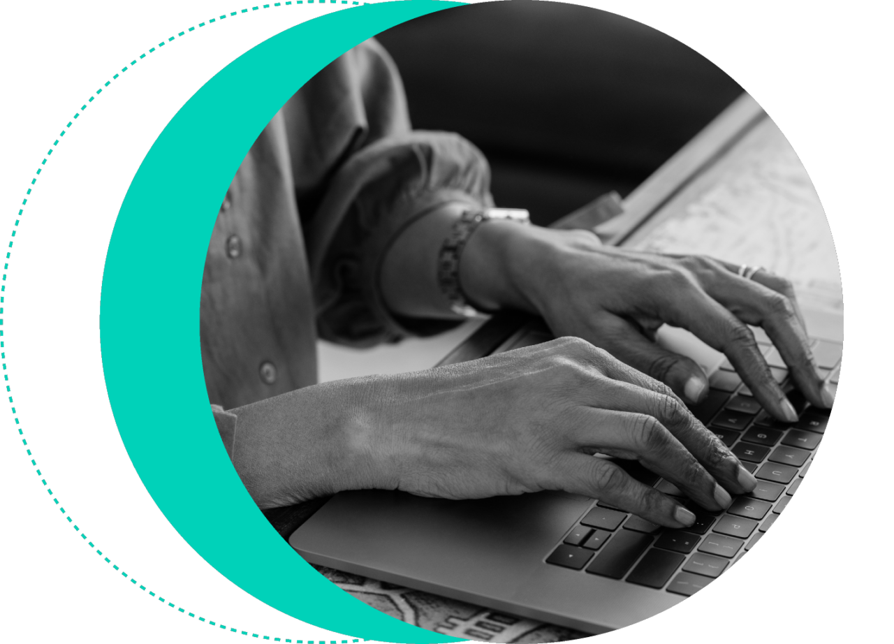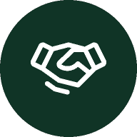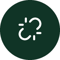 A white abstract shape resembling a cloud with lines radiating from it is centered on a dark green circular background.