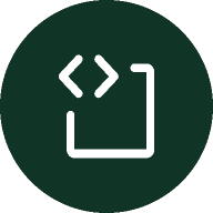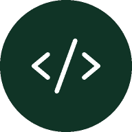 A dark green circle with a white forward slash inside two angle brackets, representing a code or programming icon.