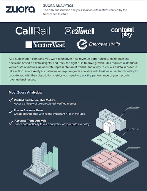 The fastest growing companies in the Subscription Economy know they need subscription metrics to make informed decisions. With Zuora Analytics, customers will get dozens of essential subscription metrics out-of-the-box with easy access to insights and trend analysis all on a configurable, self-service dashboard.