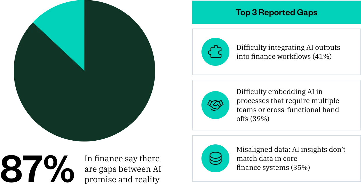 A vast majority (87%) of finance and accounting decision makers say there are gaps between AI promise and reality in finance. And for many, making AI work within real financial operations is the real challenge.