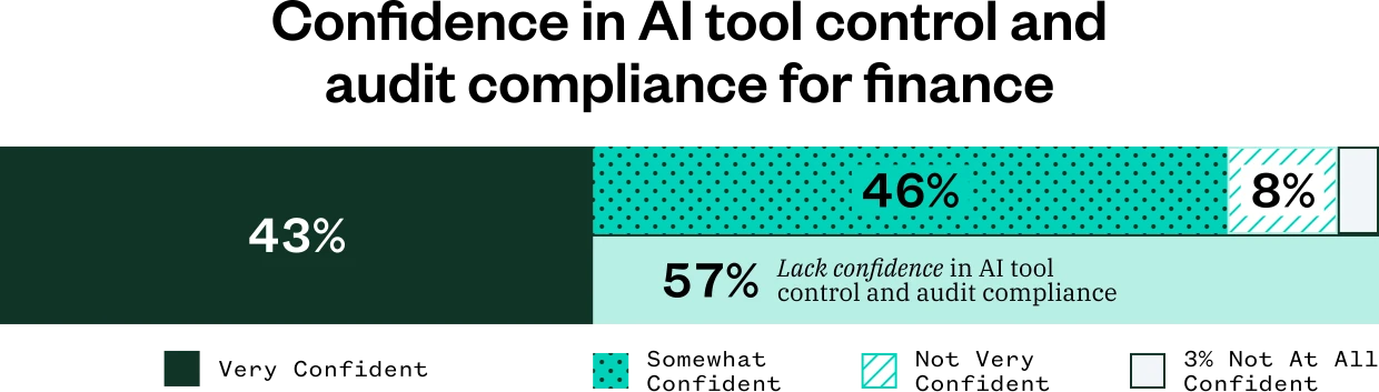 While the data shows leaders whose finance teams use AI tools have a baseline level of confidence, it hasn’t yet translated into full confidence. Only 43% say they are “very confident” that the current AI tools used by their finance team will operate within their existing financial controls and audit frameworks. That leaves a majority who range from only “somewhat confident (46%)” to “not at all /not very confident (11%).” In finance, that level of doubt doesn’t just slow adoption, it helps explain why AI investment isn’t yet translating into measurable impact.
