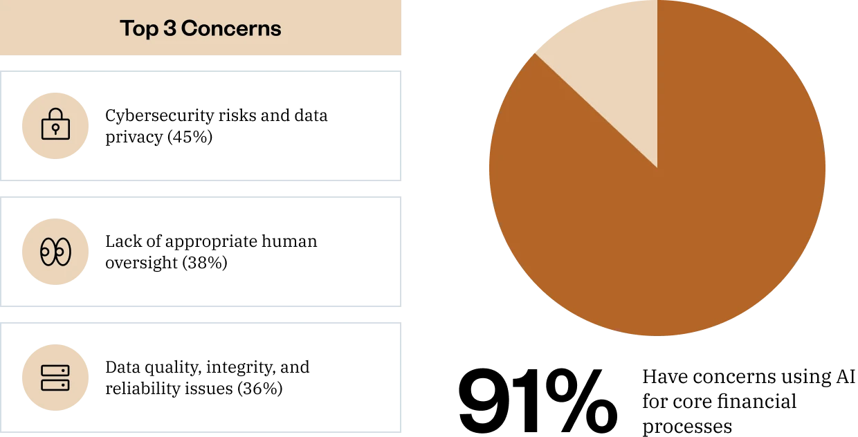 Digging deeper, these concerns aren’t abstract, but rooted in specific, high-stakes risks. The top three concerns about using AI to operate core financial processes are:
