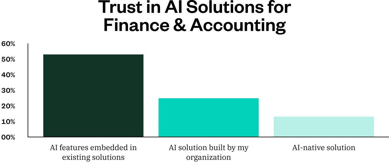 So what does “trustworthy AI” actually look like in the context of finance? The data indicates a desire for AI embedded directly into existing systems. Over half (53%) of finance and accounting decision makers say they would trust AI features embedded in existing solutions most, compared to an AI solution built by their organization (25%) or an AI-native solution (13%) when evaluating AI tools for finances.
