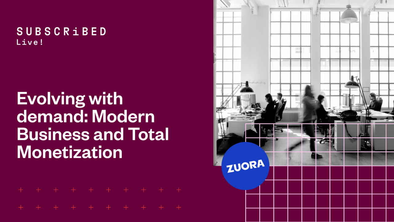 A promotional graphic for "Subscribed Live!" featuring the title "Evolving with demand: Modern Business and Total Monetization," with a background image of people working in a bright, modern office.
