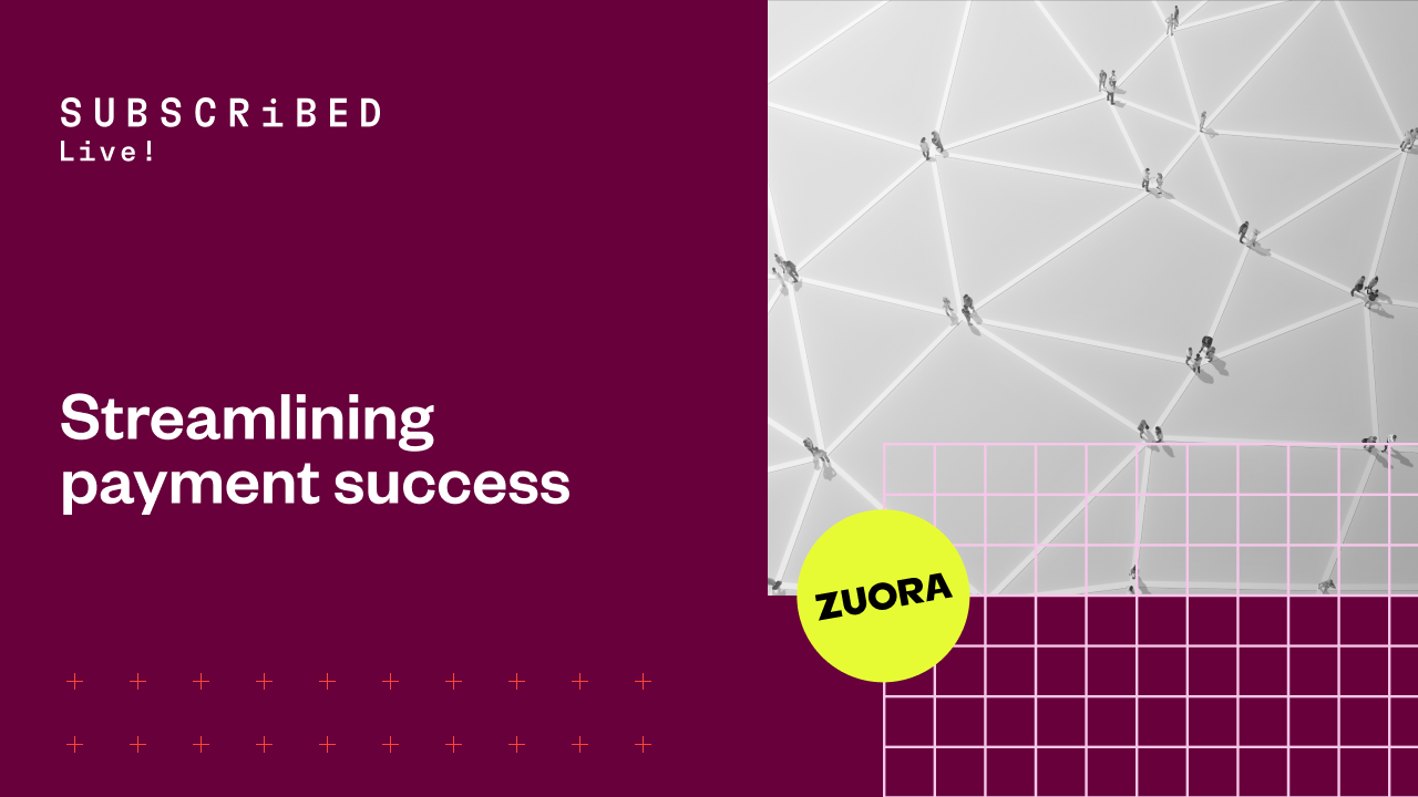 Subscribed Live! banner with text 'Streamlining payment success' against a maroon and white geometric background with 'ZUORA' label.
