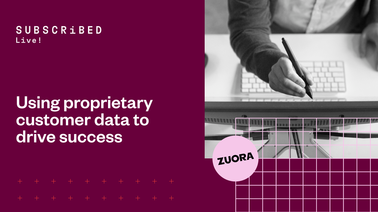 Person using a pen and digital tablet, with text reading "SUBSCRIBED Live! Using proprietary customer data to drive success" and the logo "ZUORA.