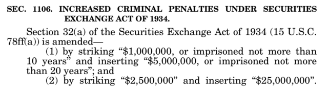 Text excerpt describing amendments to the Securities Exchange Act of 1934, increasing fines and prison terms for violations under Section 32(a).
