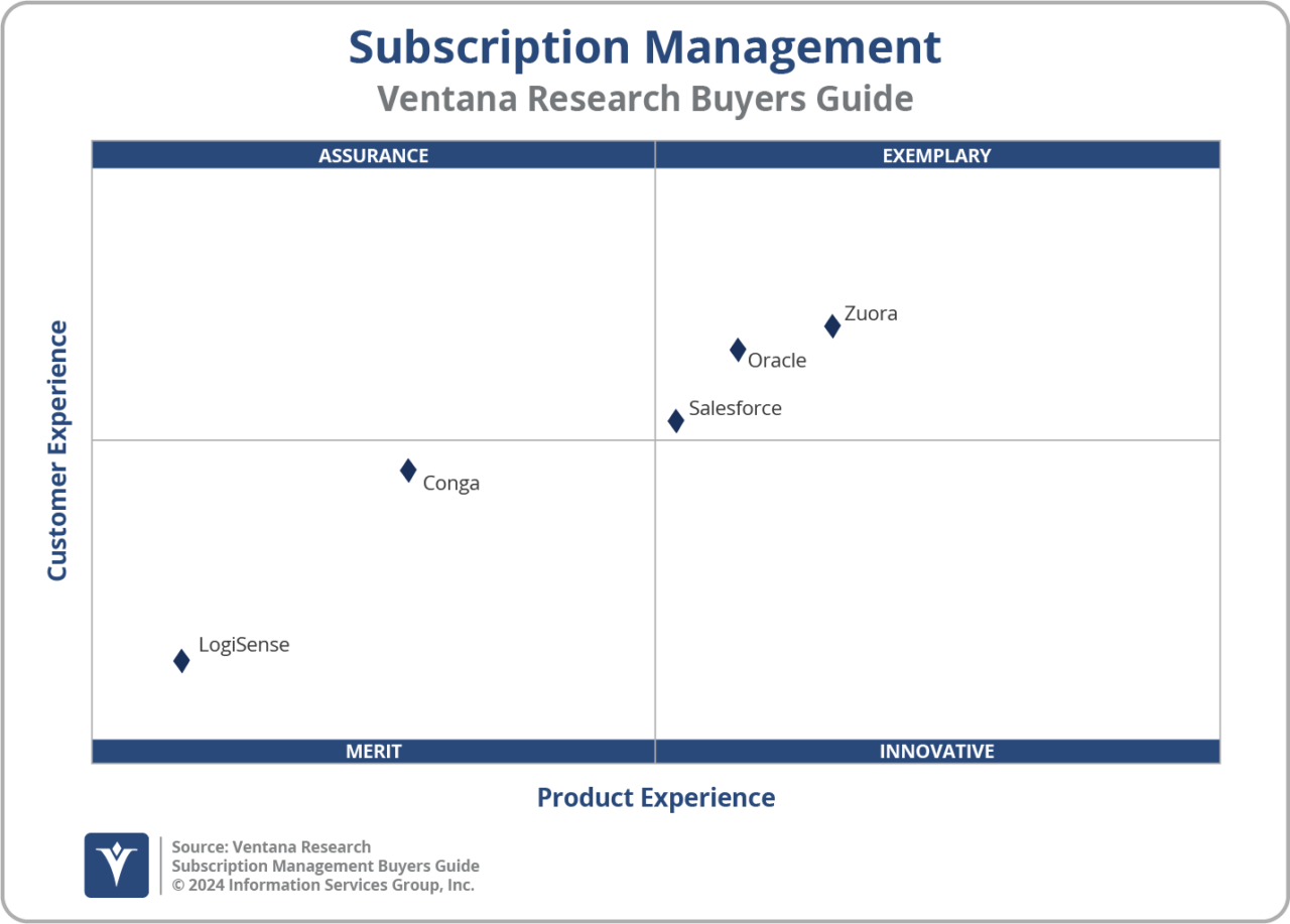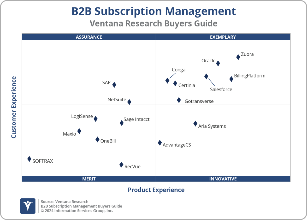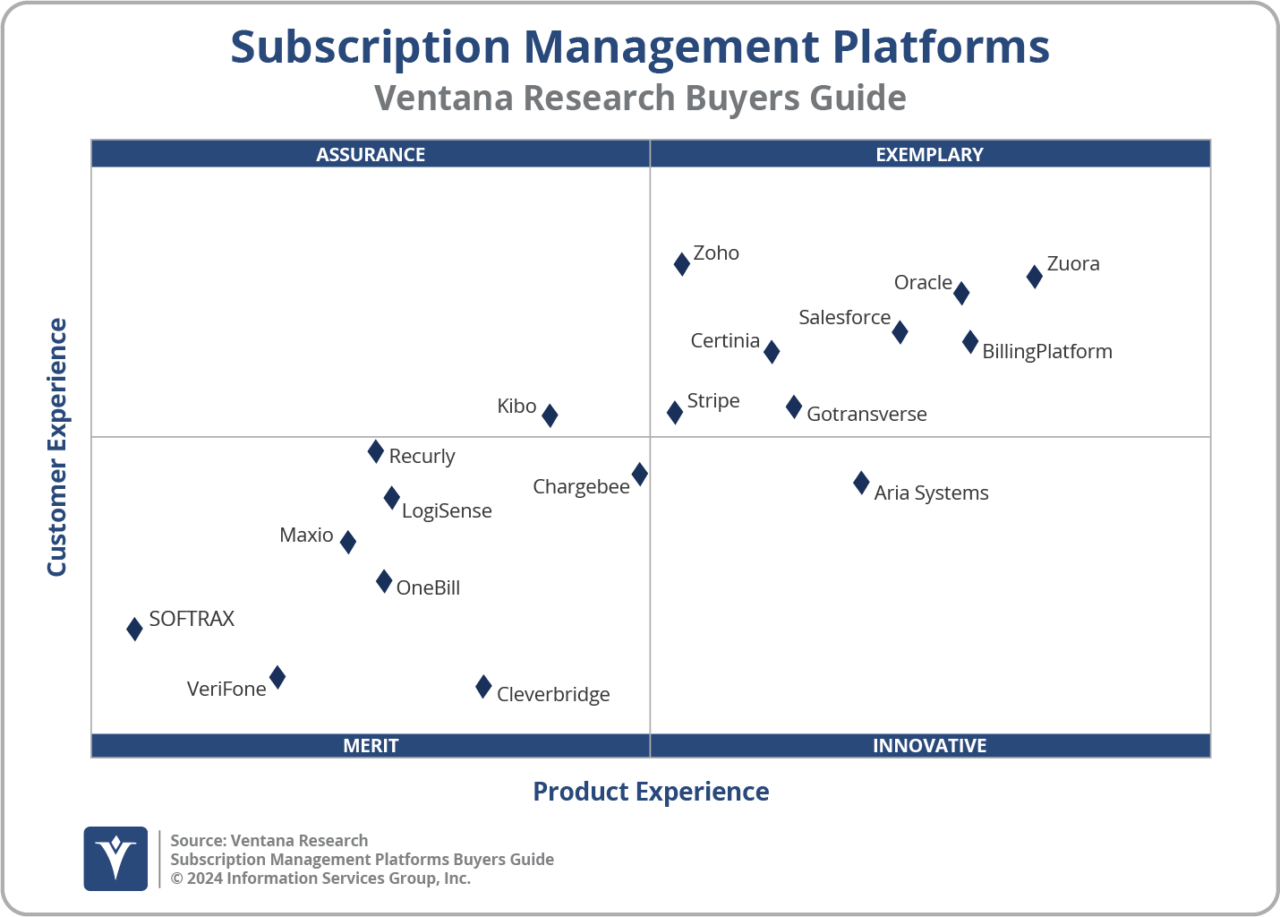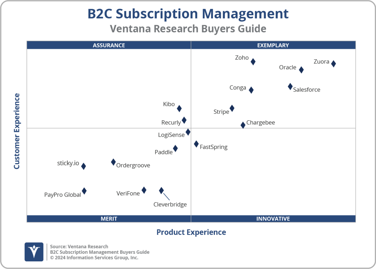 - サブスクリプション管理プラットフォーム:本調査では、さまざまなサブスクリプションモデルを支える基盤技術・インフラをサポートするソフトウェアプロバイダーを評価しています。これらのプラットフォームには、サブスクリプション、請求、支払い、顧客対応などの管理を可能にするツールや機能が含まれており、B2BおよびB2Cモデル双方においてシームレスかつ統合された体験を実現します。